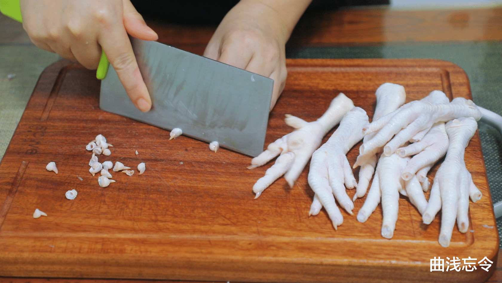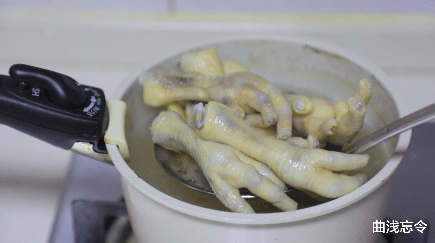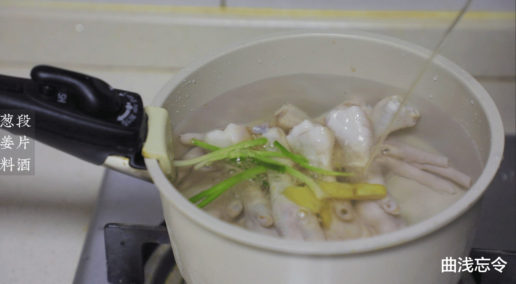 2、食材预处理(鸡爪):鸡爪切/剪去指甲,清洗干净,冷水下锅,加入姜葱料酒,煮开后再煮2分钟,中途随时撇去浮沫,捞出用热水洗净备用。