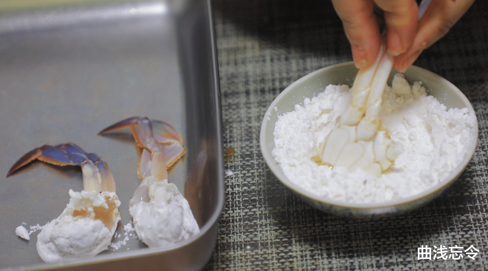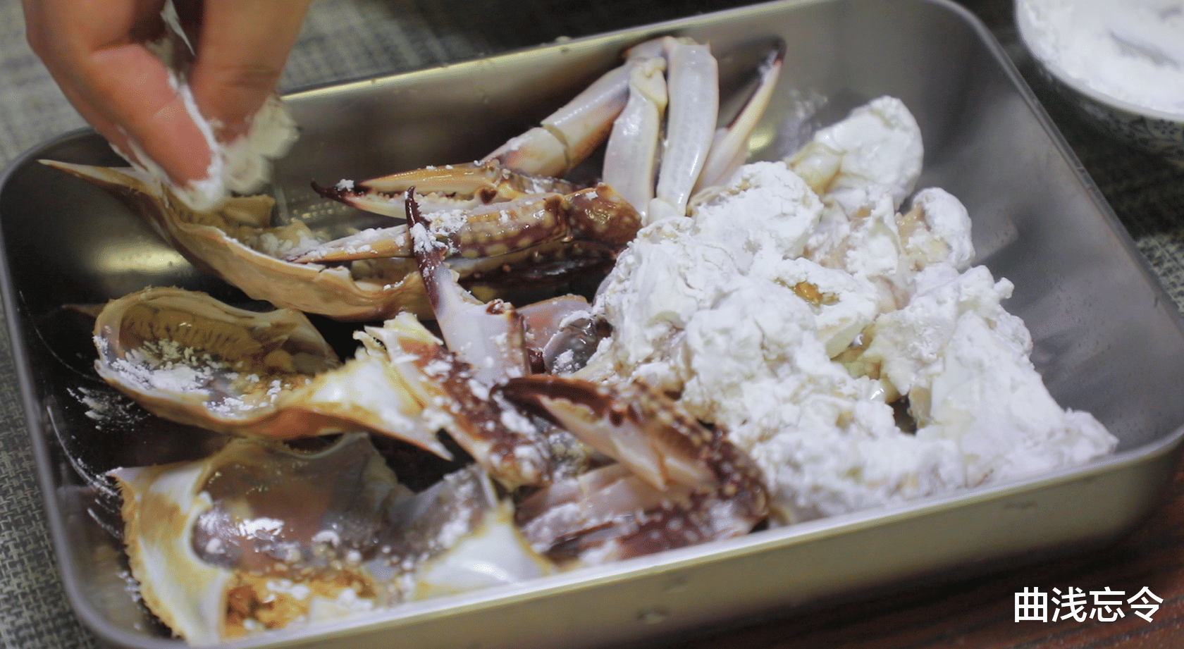 2.蟹块只需要把切面部分裹上淀粉即可,避免切面里内容和水分流失。煎制的时候也先煎切面,凝固定型后再煎其他部位。