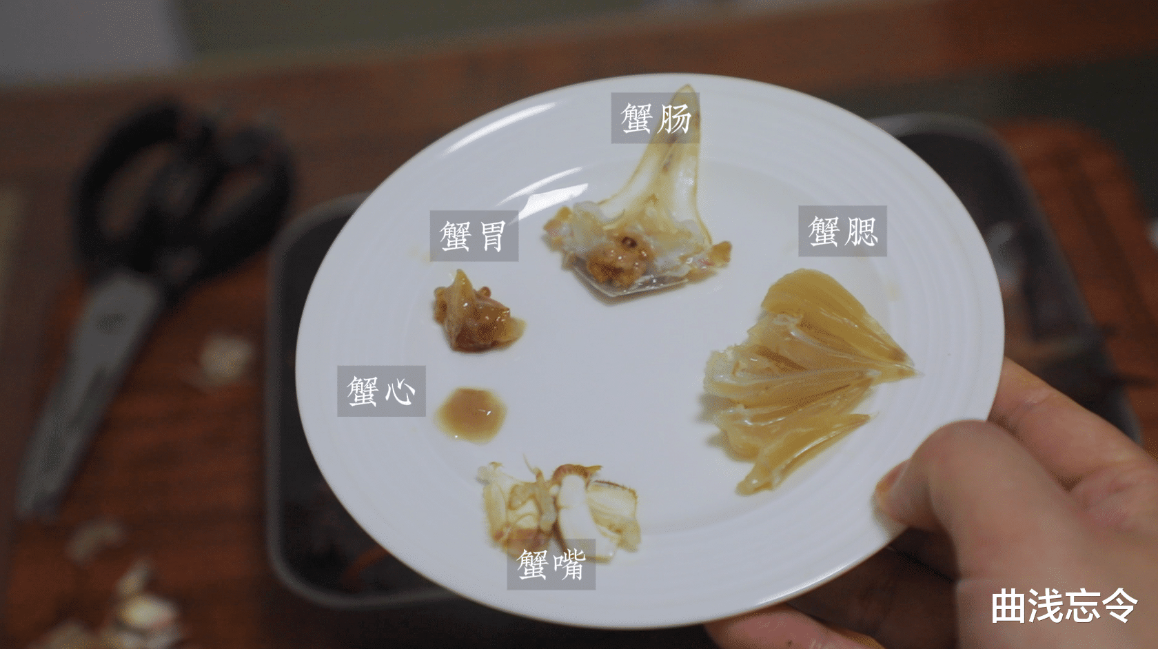 1.食材预处理时,①虾要去掉虾胃虾线不要,虾刺也建议剪掉,避免腌制时手抓可能会刺到手。②鸡爪去掉指甲,③如果怕蟹钳夹手,可在处理梭子蟹的时候先把蟹钳剪下来,再做后续处理,避免受伤。把里面不能吃的蟹肠、蟹胃、蟹腮、蟹嘴、蟹心都去掉不要,清洗干净,再剁成块。