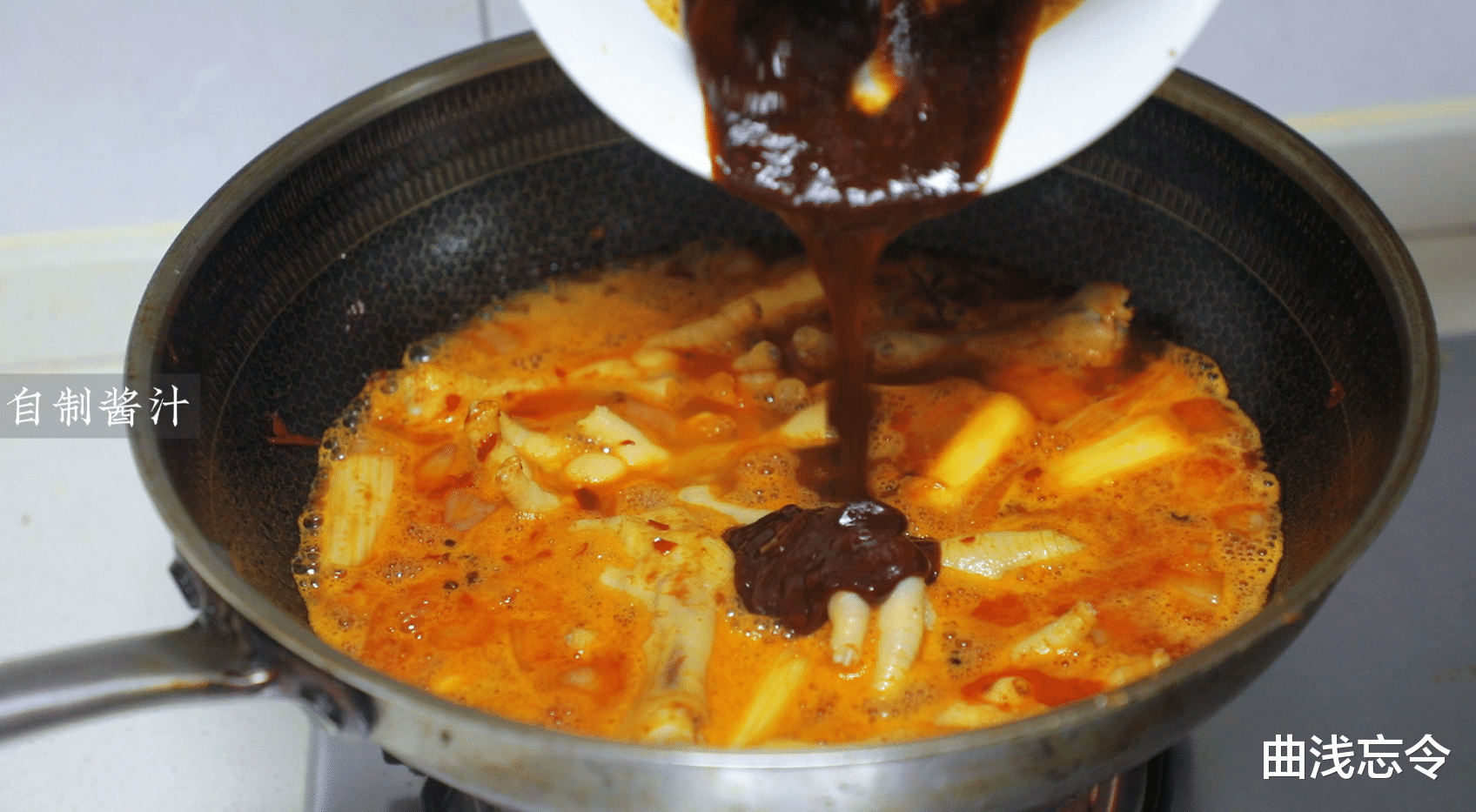 3.整个过程中没有放盐,因为酱汁配方中已经有很多酱,本身咸度已经够了,如果口味特别重,可以后期尝下咸淡再看是否加盐。