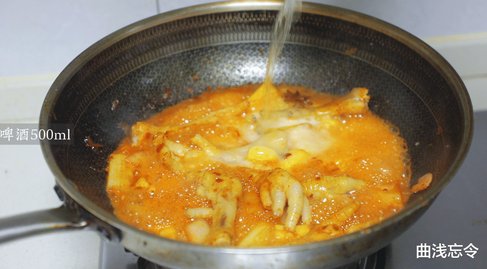 7、炒制:锅中余油,加入姜片、大葱段、洋葱块、蒜粒,八角1颗、花椒粒20粒,翻炒出香气,再加入1勺豆瓣酱,炒出红油和香气,加入鸡爪翻炒均匀,倒入500ml啤酒,再加入提前调好的酱汁。