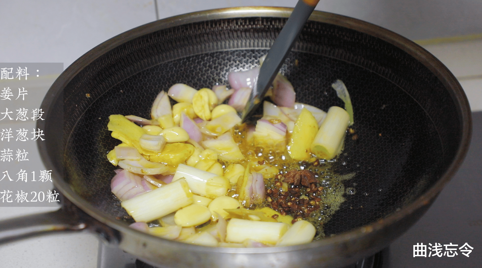配料:洋葱半个、生姜2块、大葱1根、蒜头2个、小葱几根;八角1颗、花椒粒20粒;土豆淀粉适量