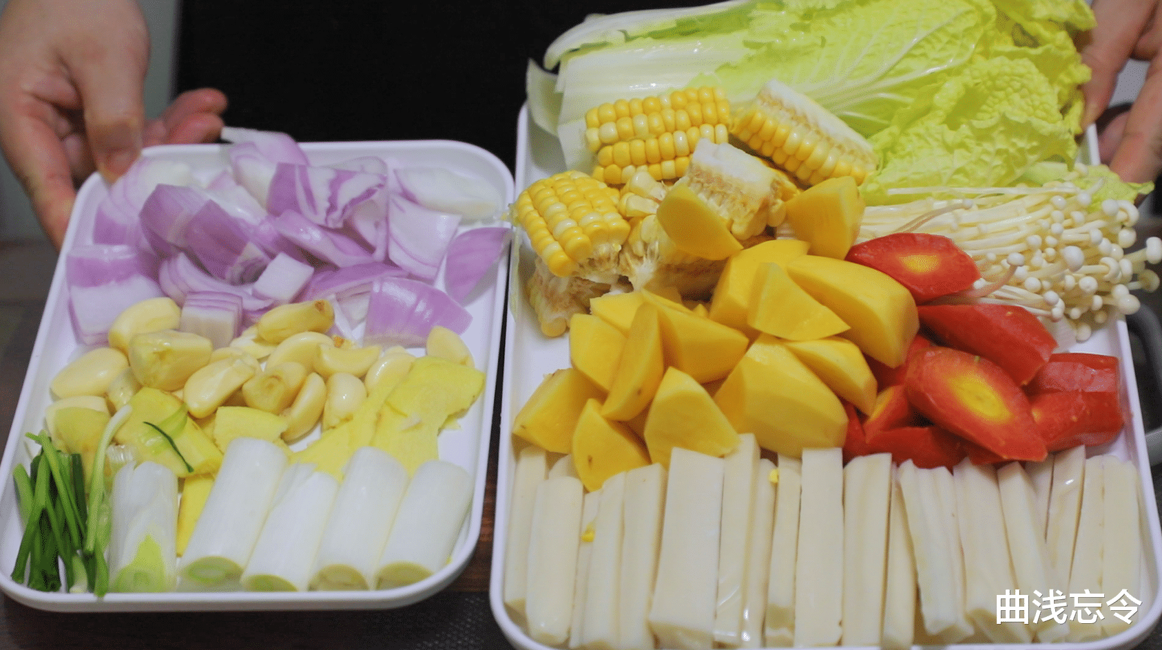 4、食材预处理(配菜和配料):玉米切条、年糕切条、土豆和胡萝卜切块;洋葱切大块、大葱切段、姜切片、蒜去皮、小葱切段和少许葱花。