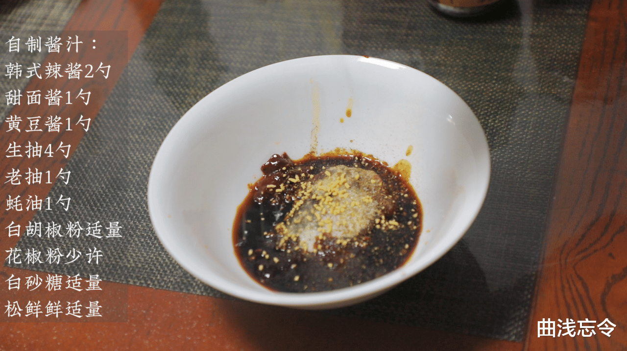 酱汁:韩式辣酱2勺、甜面酱1勺、黄豆酱1勺、生抽4勺、老抽1勺、蚝油1勺、白胡椒粉适量、花椒粉少许、白砂糖适量、松鲜鲜适量;