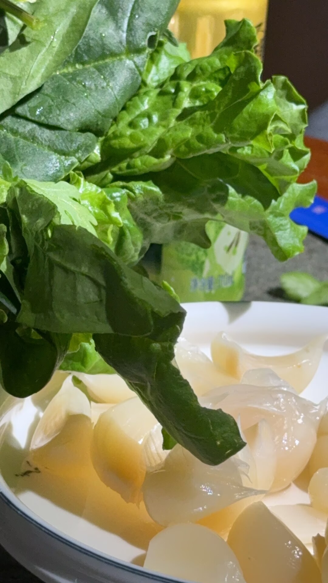 肥牛卷、黑毛肚、蟹棒…… 往筐里一倒就是 “食材自由” 现场!还有糖蒜、西瓜解腻,新鲜绿叶菜脆嫩到咬一口就飙汁~铜锅咕嘟