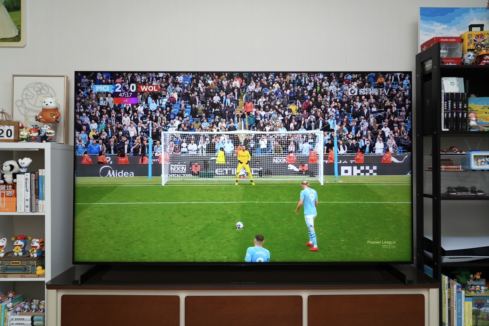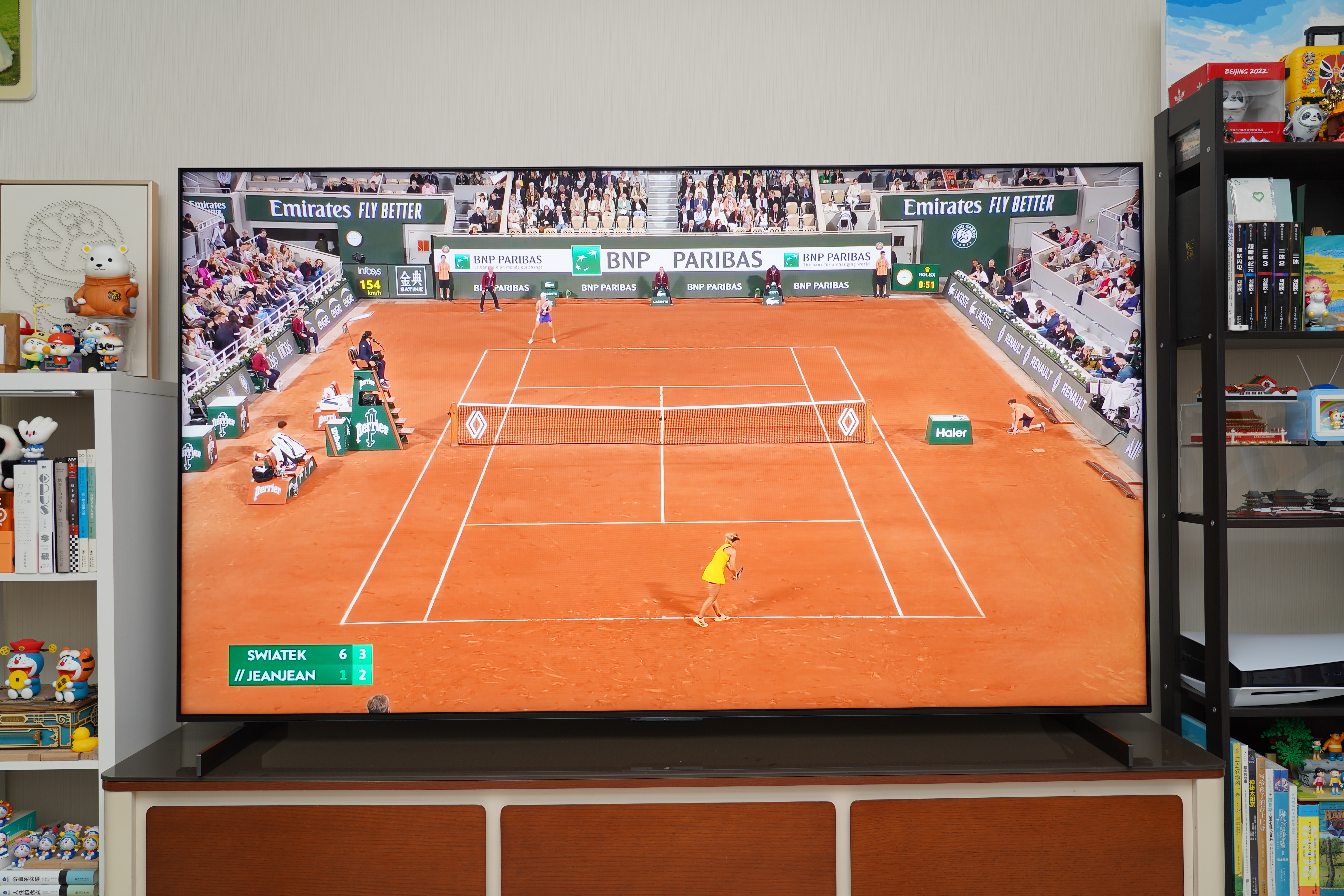 对于体育赛事爱好者来说,这台电视的表现让人亮眼。足球赛事中的绿茵场地、红土网球场的颜色还原都十分到位,抓取的人物动作也十分细致。