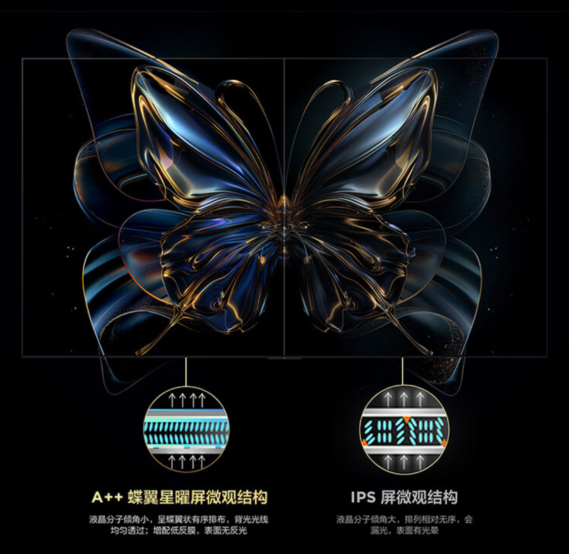 这种A++蝶翼星耀屏采用了纳米级仿生科技,能够更精准地控制通过液晶层的光线,这种高端VA屏相对于传统IPS屏幕的对比度提升更加明显,整体画面表现也更加到位。