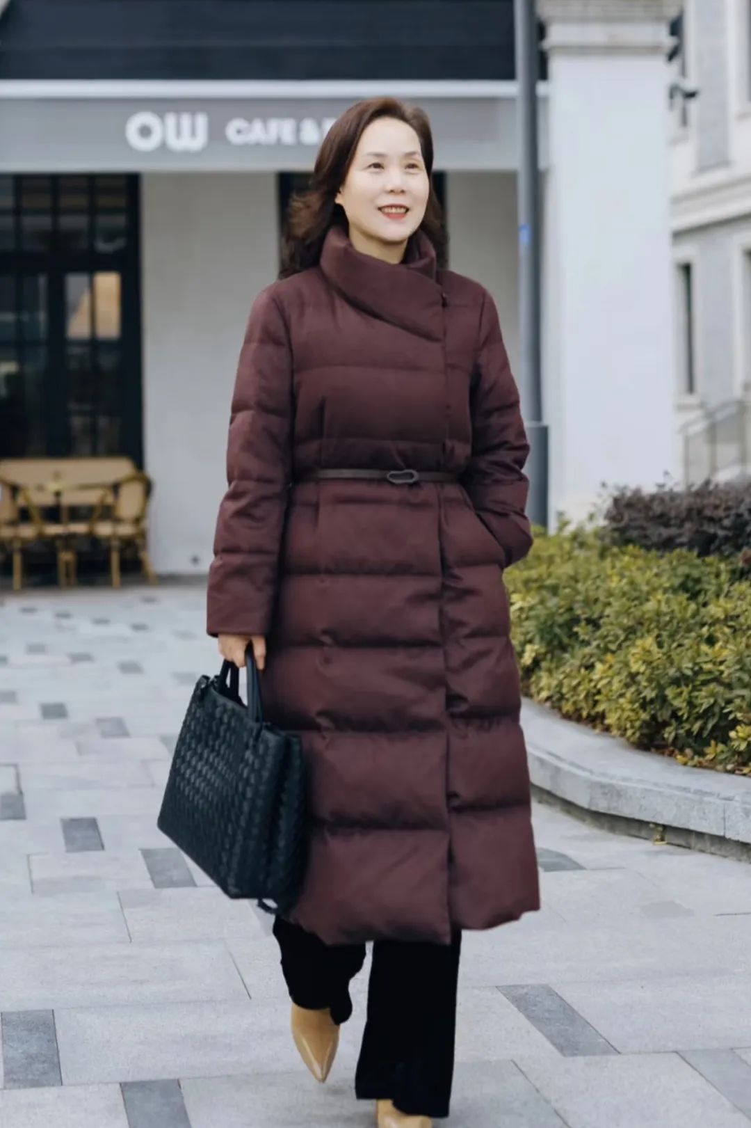 关于羽绒服版型的选择,一定要考量自己的身材条件,尤其是对于60岁130斤的大龄女性来说,切记不能跟风,要考量上身后的塑形效果。尽量避免过于宽松、廓形的羽绒服,以收腰版型为首选,或是带有腰带设计的款式,都可以通过明示腰线、收紧腰身来优化身材塑形。② 羽绒服长度要选对,才不压身高