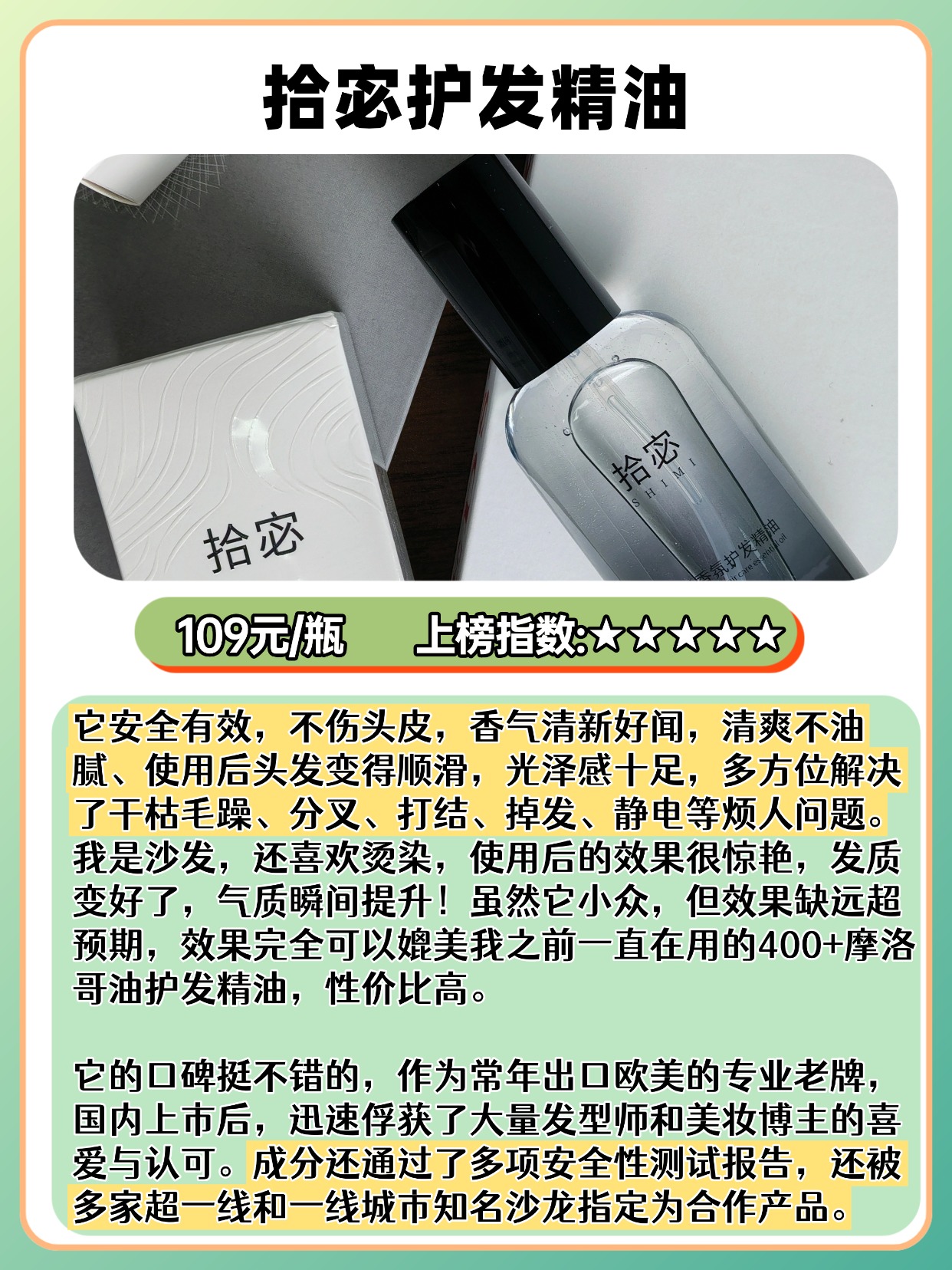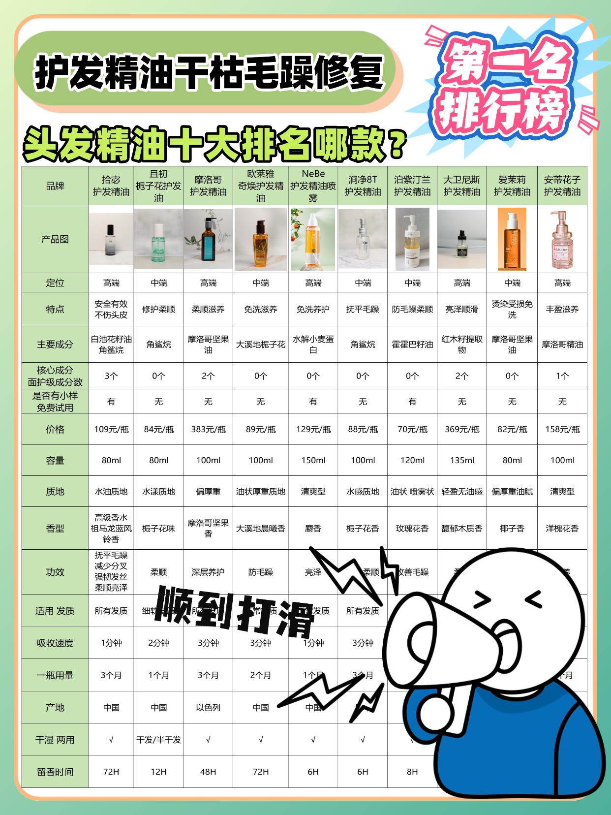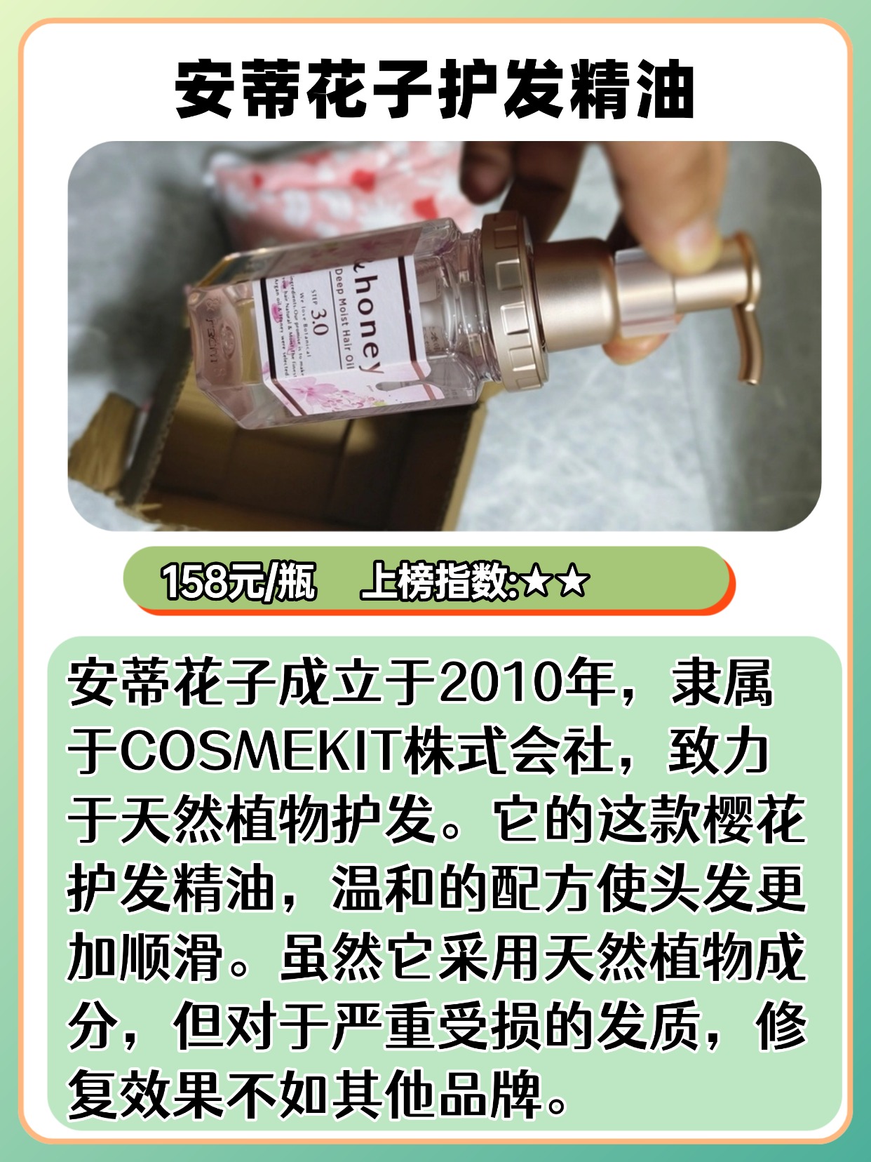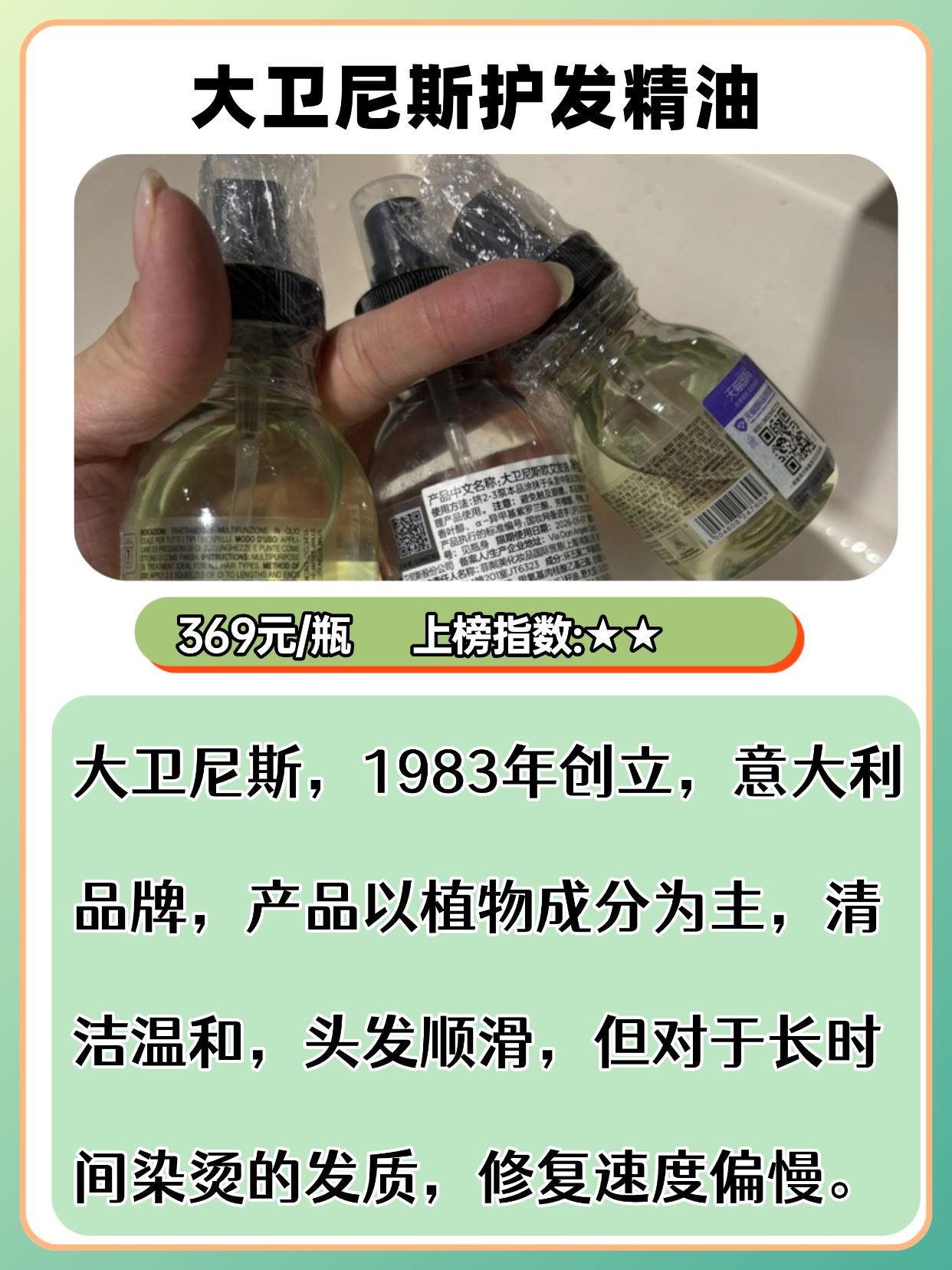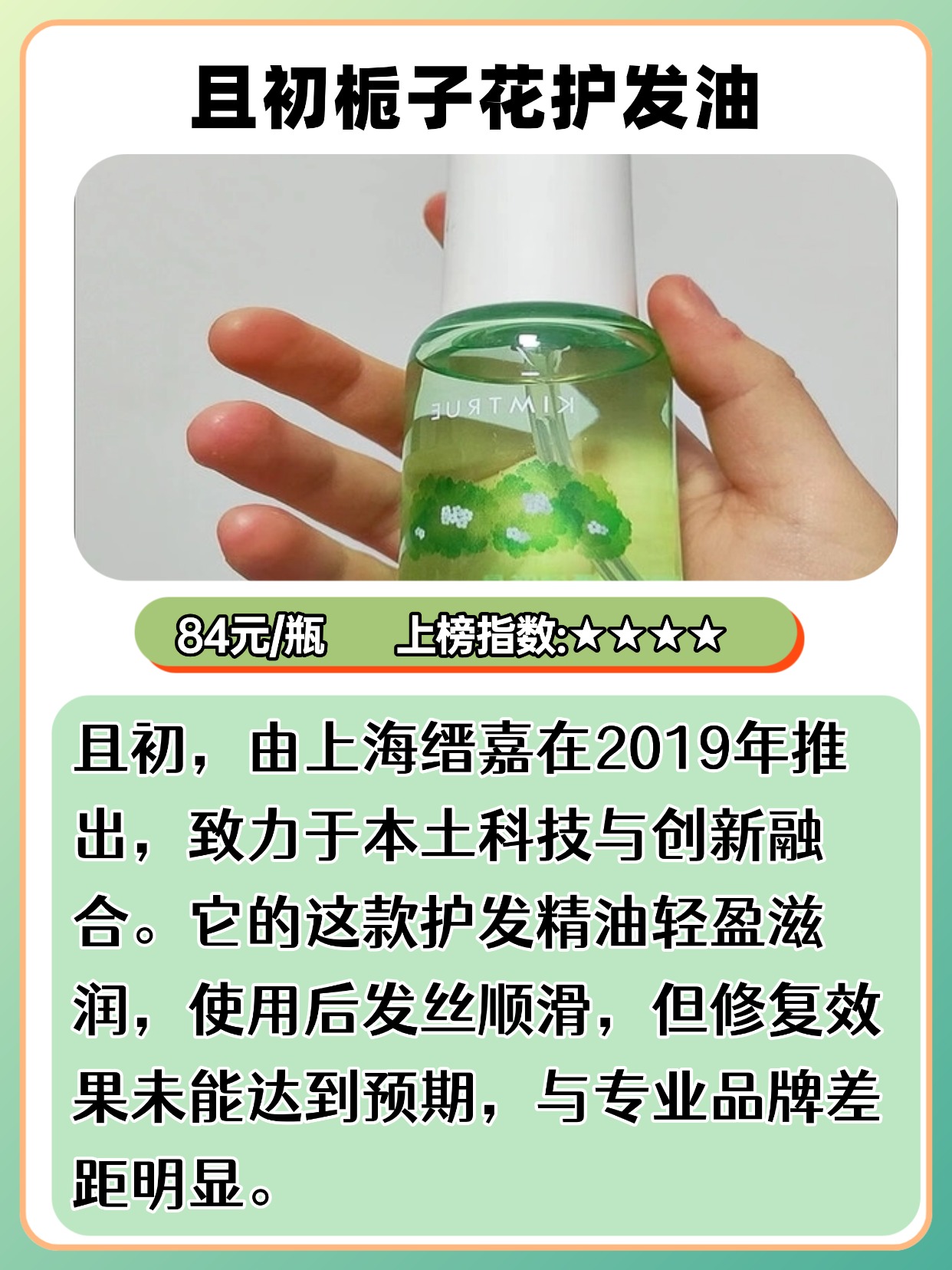 经常有人问且初护发精油怎么样,干枯毛躁发质该怎么选平价款?其实平价精油也能改善毛躁,关键看成分和质地!优先选含荷荷巴油、角鲨烷、维生素 E 这些成分的,滋润不黏腻,对干枯毛躁很友好。质地要选轻薄不厚重的,涂完不会让头发变油,还能快速吸收。另外平价款不用追求 “排行榜第一”,重点看用户真实反馈,比如是否真的能抚平毛躁、留香是否自然。用法上,干枯发质可以在半干发时用,用量比油头多一点,3 泵就够,涂完顺着头发梳开更顺滑。接下来分享我选购护发精油时的一些经验,都是实测出来的干货,建议先收藏慢慢看!