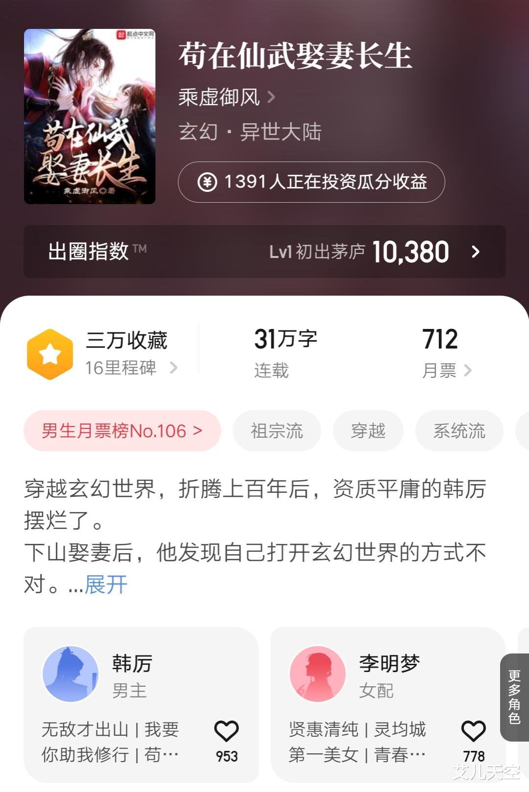 小说书名很典,《苟在仙武娶妻长生》属实是结合了现在流行的各种要素了。