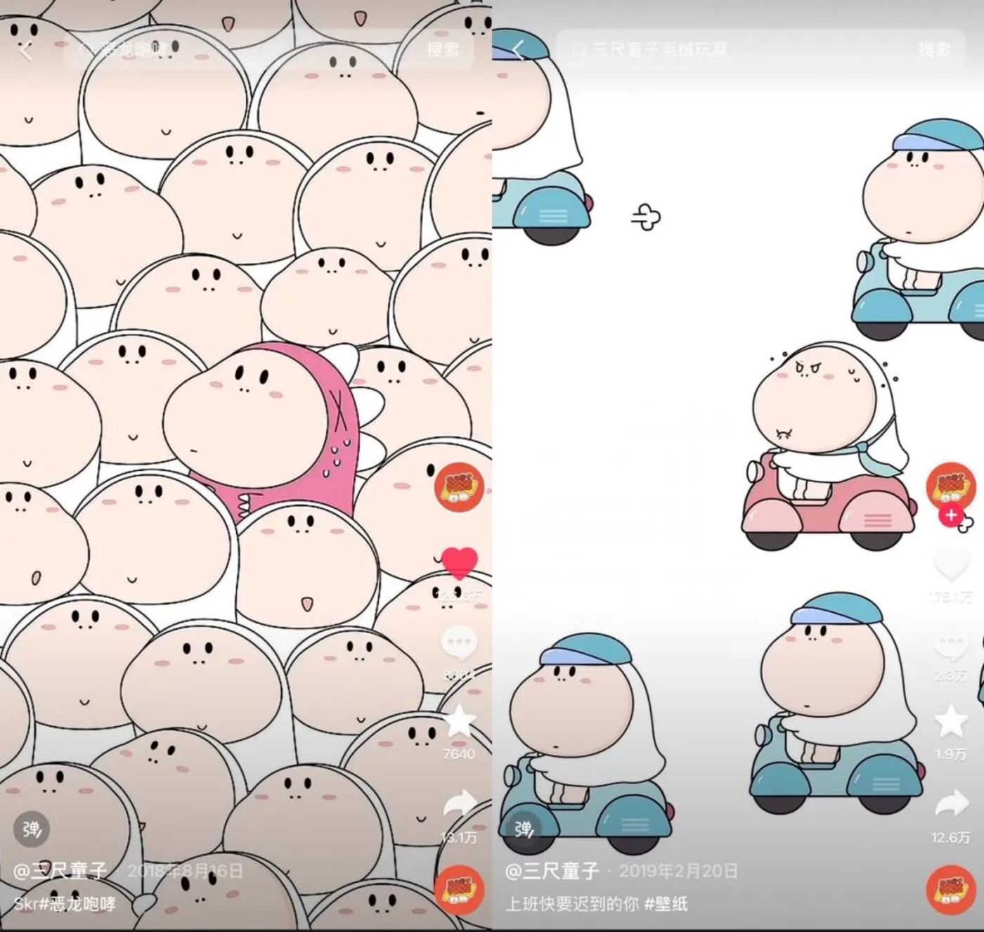 这是2019 年的夏天,他刚从品牌视觉设计转型 IP 孵化,抱着 “试试水” 的心态,把这个叫 “晴天娃娃” 的表情包发在了抖音上。没成想,这种无厘头的节奏、圆滚滚的可爱形象,刚好戳中了打工族的情绪点:摸鱼时刷到会笑出声,加班时看一眼能解压,就连朋友间吐槽都离不开这个 “魔性娃娃”。短短几个月,“晴天娃娃” 的短视频单条点赞超百万,粉丝一路涨到 200W+。