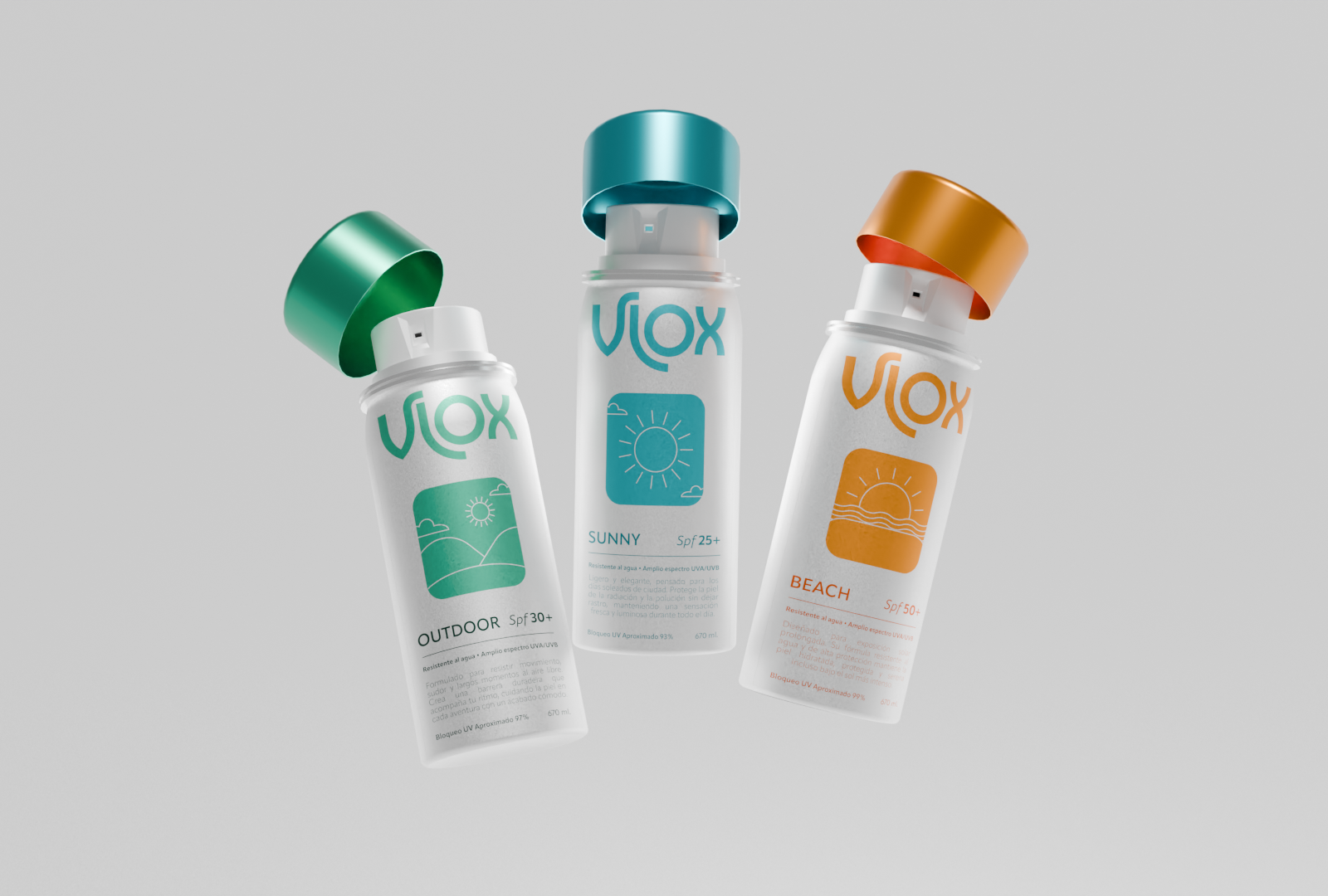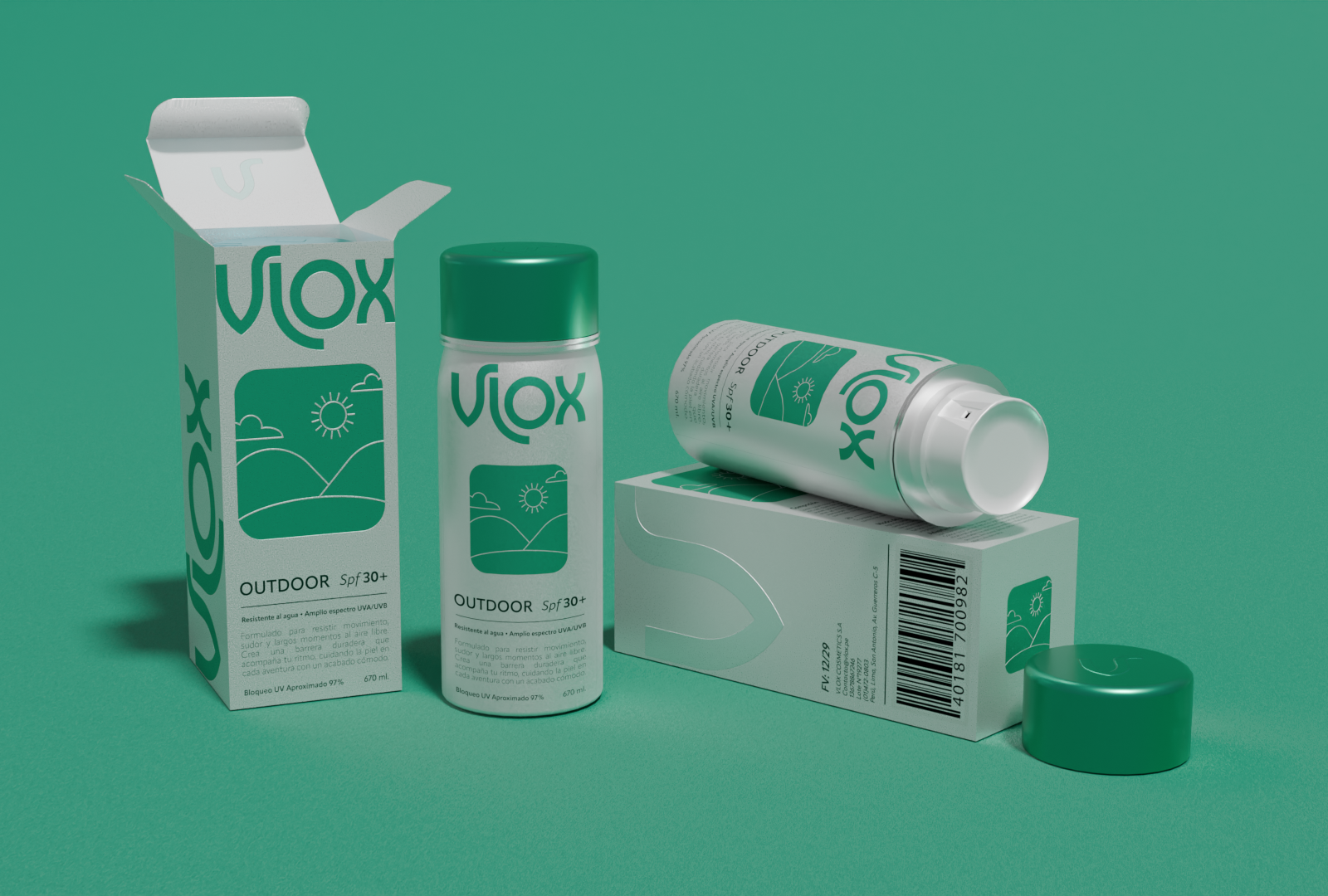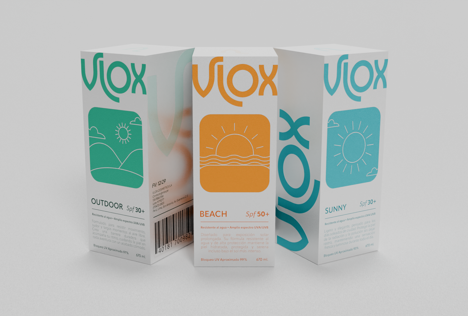 Vlox的防晒系列包装以场景化设计为核心,通过色彩与图形的叙事,精准触达户外、海滩、日常三大使用场景: