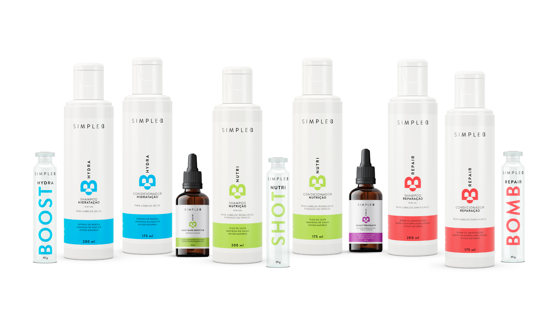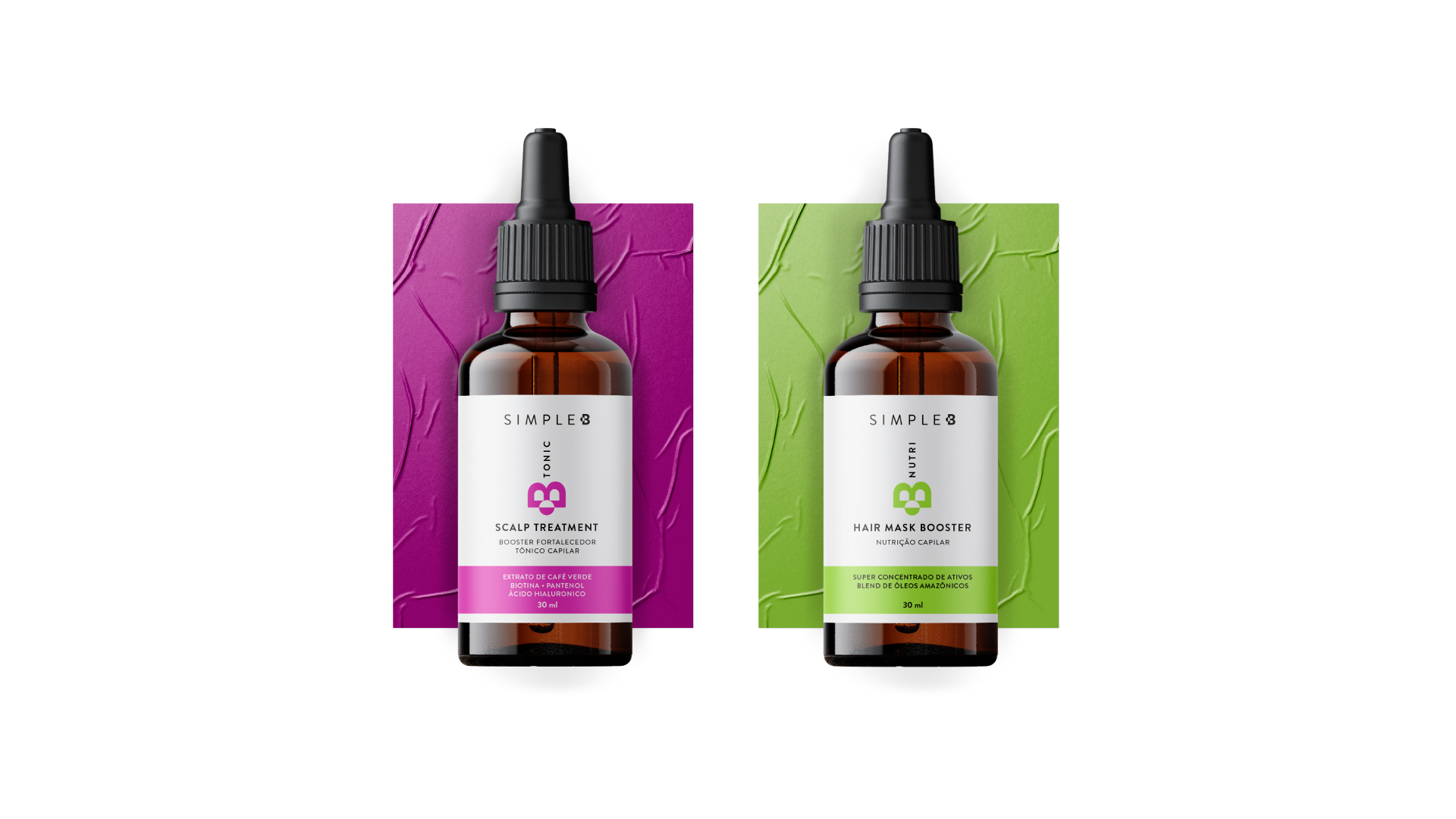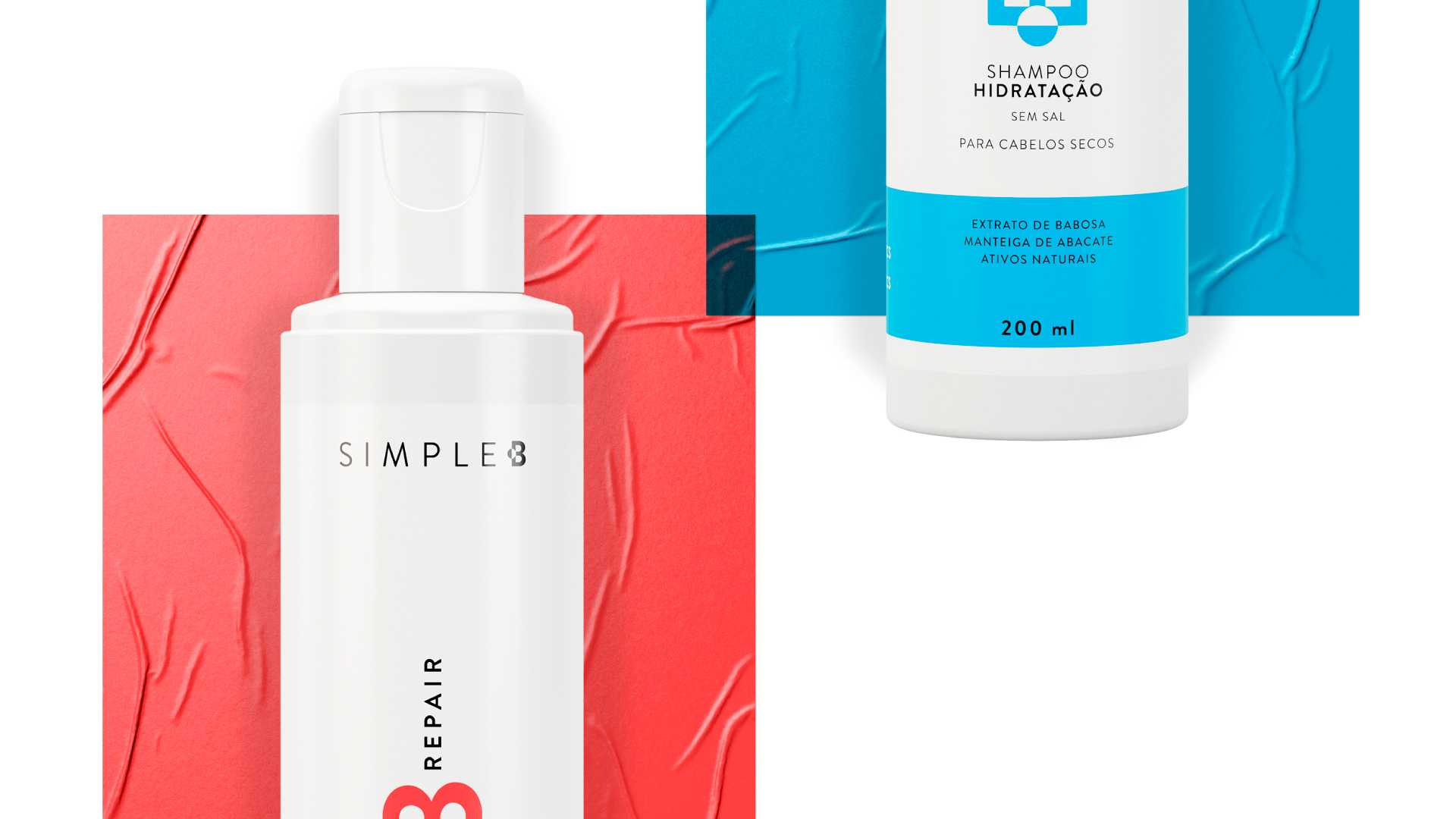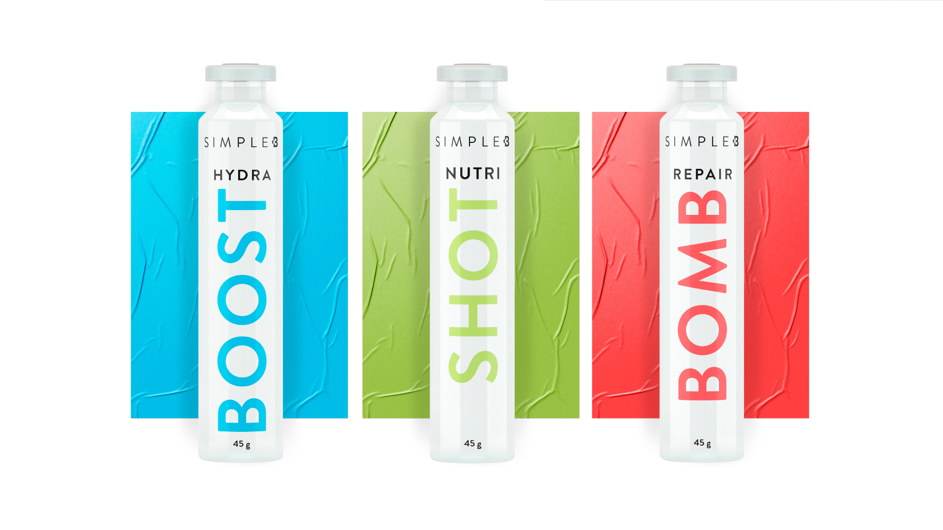 Simples的包装以极简主义为核,通过干净的白色瓶身与竖向排版构建视觉秩序,传递专业、高效的调性。设计亮点在于: