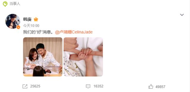 10月24日早上10点整,韩庚和卢靖姗夫妇双双在社交账号上发文,官宣了二胎出生的好消息。
