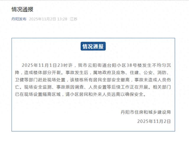 11月2日,江苏丹阳市住房和城乡建设局发布“情况通报”称,11月1日23时许,丹阳市云阳街道台阳小区38号楼发生不均匀沉