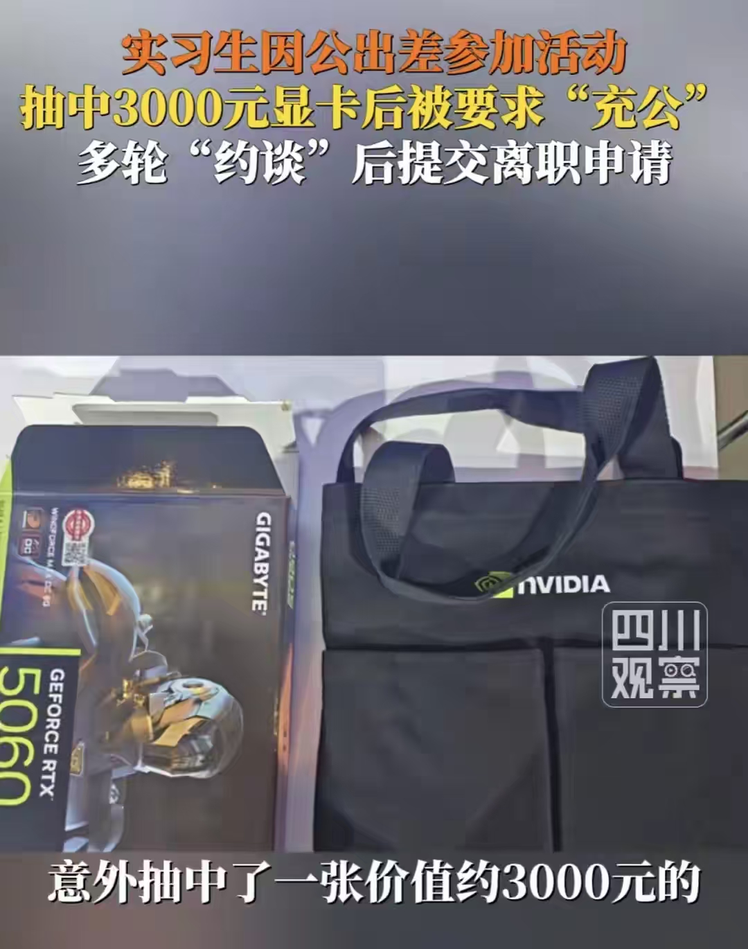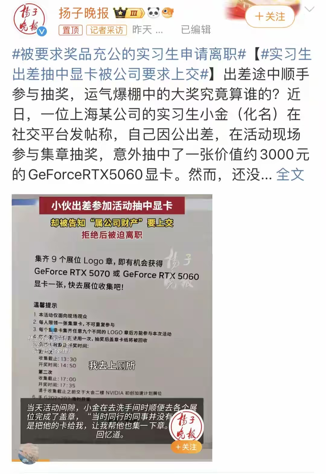 实习生真的一点地位都没有啊,连老天爷赏的运气,都要被公司当成“公款”追缴!上海实习生小金,出差期间顺手抽中一张显卡,哪料这份幸运奖品,竟成了他职场生涯的“催命符”。