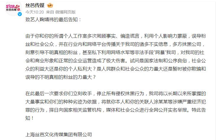 2025年12月18日,丝芭放出“最后通牒”,称要举报鞠婧祎及关联人涉嫌“严重经济犯罪”。