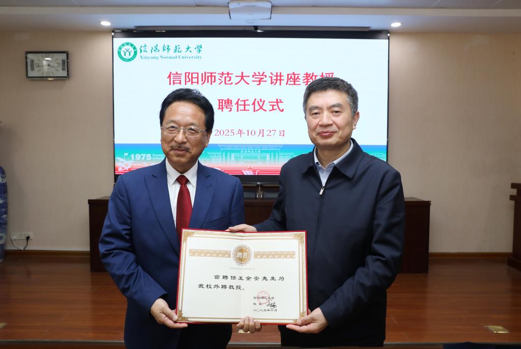 10月27日,信阳师范大学在化学楼举行王金安院士讲座教授授聘任仪式。校长余本海出席仪式并向王金安院士颁发聘书,副校长井强