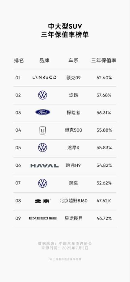 当新车变成旧车,当初的购车喜悦往往会被残值缩水的现实冲淡。在汽车消费日益理性的今天,"如何让爱车保值"已成为消费者决策的关键因素。中国汽车流通协会与精真估最新发布的《2025上半年中国汽车保值率研究报告》显示,领克品牌以54.58%的三年保值率位居自主品牌前三甲,而旗下的领克09更是在竞争激烈的中大型SUV细分市场中脱颖而出,以62.40%的保值率一骑绝尘。这份数据用硬核实力证明:高价值车型不仅能带来卓越体验,更能守护用户的长期利益。