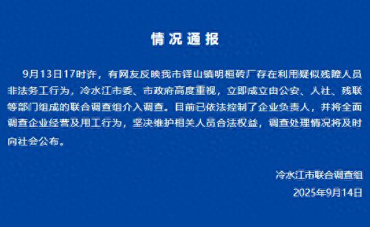 9月13日17时许,有网友反映我市铎山镇明桓砖厂存在利用疑似残障人员非法务工行为,冷水江市委、市政府高度重视,立即成立由公安、人社、残联等部门组成的联合调查组介入调查。目前已依法控制了企业负责人,并将全面调查企业经营及用工行为,坚决维护相关人员合法权益,调查处理情况将及时向社会公布。