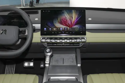 醒狮造型很吸睛,硬派中藏着细腻质感:一进 4S 店展厅,我就一眼看到了摆在中央的猛士 M817,选的是秦岭绿配色,阳光下漆面质感很细腻,不同角度看过去光影流转,辨识度挺高。它的个头不算小,5100mm 的车长搭配 1998mm 的车宽,站在旁边能明显感觉到它的气场,但线条硬朗规整,并不会让人觉得笨拙。后来听工作人员说设计灵感源自东方醒狮,仔细端详下来,车头的轮廓和机罩上的两条特征线,还真有点狮首昂首的姿态。车头的狮吼格栅很有辨识度,封闭格栅配上发光饰条,打开日行灯后中间的 M - LOGO 灯一直亮着,白天看着低调,想必晚上点亮后会更醒目。大灯的造型也挺特别,轮廓像古代的兵器戈,日行灯的菱形花纹据说源自越王勾践剑,这些小细节能看出设计上的用心。车尾的超红 LED 尾灯点亮后效果不错,298 可 LED 组成的光幕,搭配激光精细皮纹,看起来很有质感。拉开车门坐进去,内饰风格和外观很呼应,横平竖直的线条搭配金属材质,棱角分明,很有机械感。展车内饰是迎松墨配色,黑色搭配暗绿,氛围沉稳又不失生机。让我意外的是,它完全没有传统硬派越野车内饰的粗糙感,全车 91.2% 都做了软包处理,顶棚和后备厢用的都是绒质面料,手能摸到的地方基本都是柔软的触感。车内的几个小设计挺戳我。方向盘旁边的飞航旋钮,是潜水腕表的设计风格,转动时阻尼适中,通过它切换驾驶模式很顺手。车内门把手握感很坚实,关闭车门时会发出类似机械咬合的声音,给人一种很扎实的感觉。车顶的飞航拨杆和前车顶灯集成在一起,上面有 6 个 AUX 顶置开关,对应着预留的电源接口,后续想加装设备会很方便,对喜欢改装的人来说这个设计很实用。还有那些金属脉冲按键,按下时会伴随氛围灯的呼吸式光效,晚上开车时像星光点缀,既实用又有氛围感。