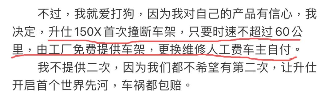 不过,陶总也是很大度,明确表示接下来,只要速度不超过60码,撞断车架升仕免费赔全新的,只提供一次服务。我认为已经很大度了。