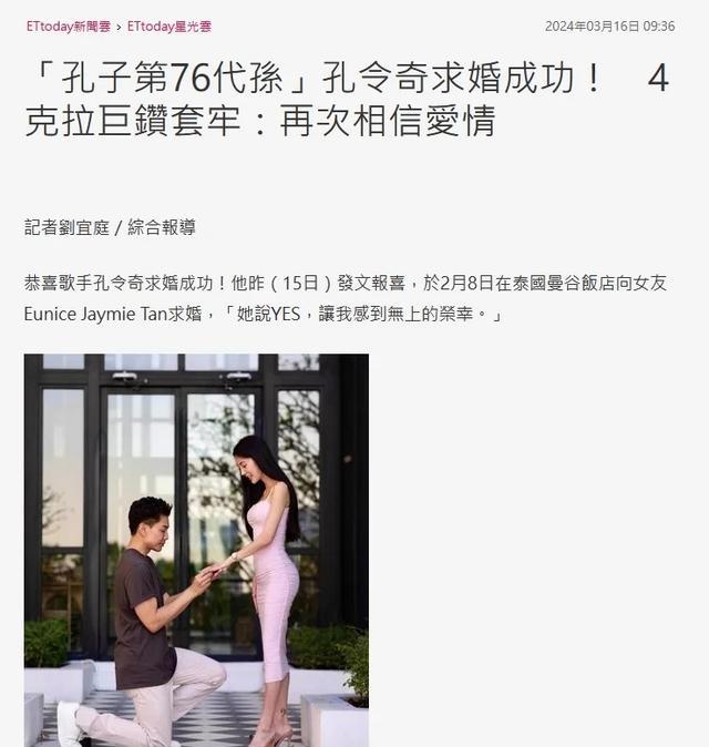 2024年3月,孔令奇在泰国曼谷现场单膝跪地,以4克拉钻戒求婚成功,从照片上看,孔令奇穿得挺朴素,EuniceJaymie打扮得光彩照人,看看他俩脸上那笑容,真是羡煞旁人。