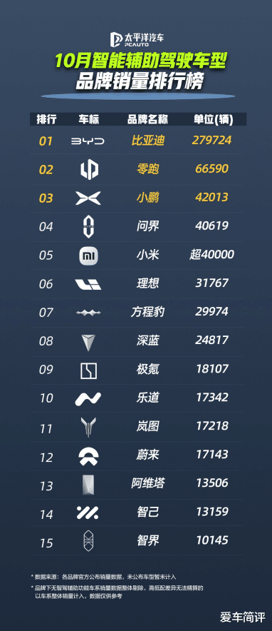 在近日发布的太平洋汽车10月智能驾驶车型品牌销量榜中,比亚迪以绝对优势位居首位,是第二名的四倍有余,领先优势显著。