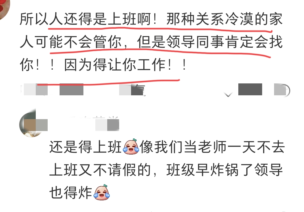 还有的网友说,人还是得上班,有社会关系,如果关系冷漠的家人不管你,但是领导同事肯定会找你,因为得让你工作。[笑哭][笑哭]