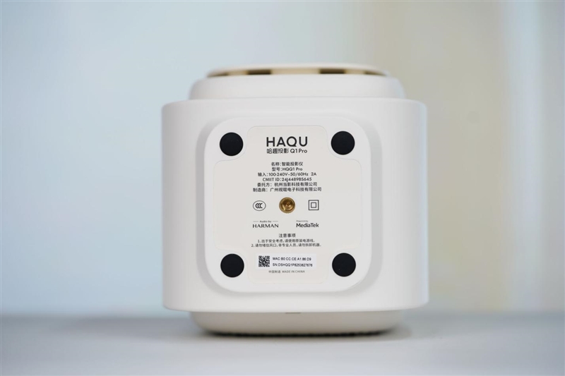 哈趣Q1 Pro投影仪的底部贴有产品详细信息,并在中央提供了一个1/4英寸的标准螺丝孔,可以用于安装落地支架或这吊装固定。