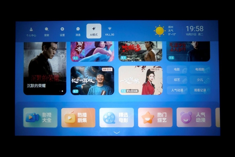 启动后进入主菜单,可以看到哈趣Q1 Pro投影仪使用的定制版当贝超级AI OS系统十分简洁,主页显示的内容比较少,也没有插入很多推荐内容。