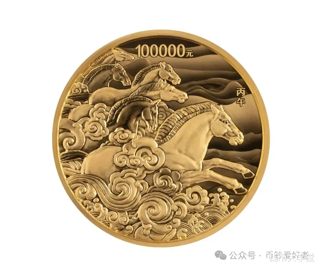 150克圆形金质纪念币背面图案为母子马造型,衬以山、草地、云组合设计,并刊“丙午”字样及面额。最大发行量1000枚。
