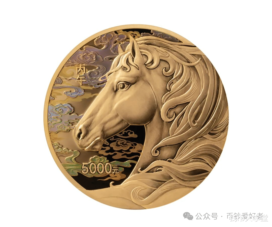 500克圆形金质纪念币背面图案为装饰马头造型,衬以祥云组合设计,并刊“丙午”字样及面额。最大发行量500枚。