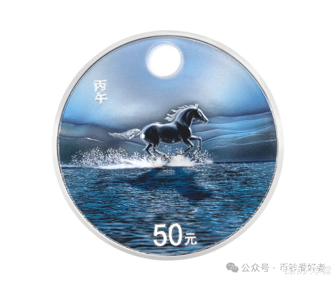 150克圆形银质纪念币背面图案为奔马造型,衬以山水组合设计,并刊“丙午”字样及面额。最大发行量8000枚。
