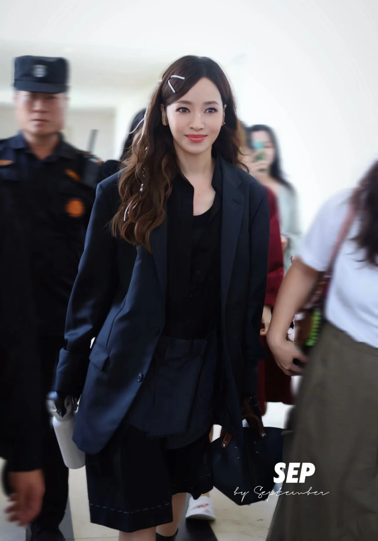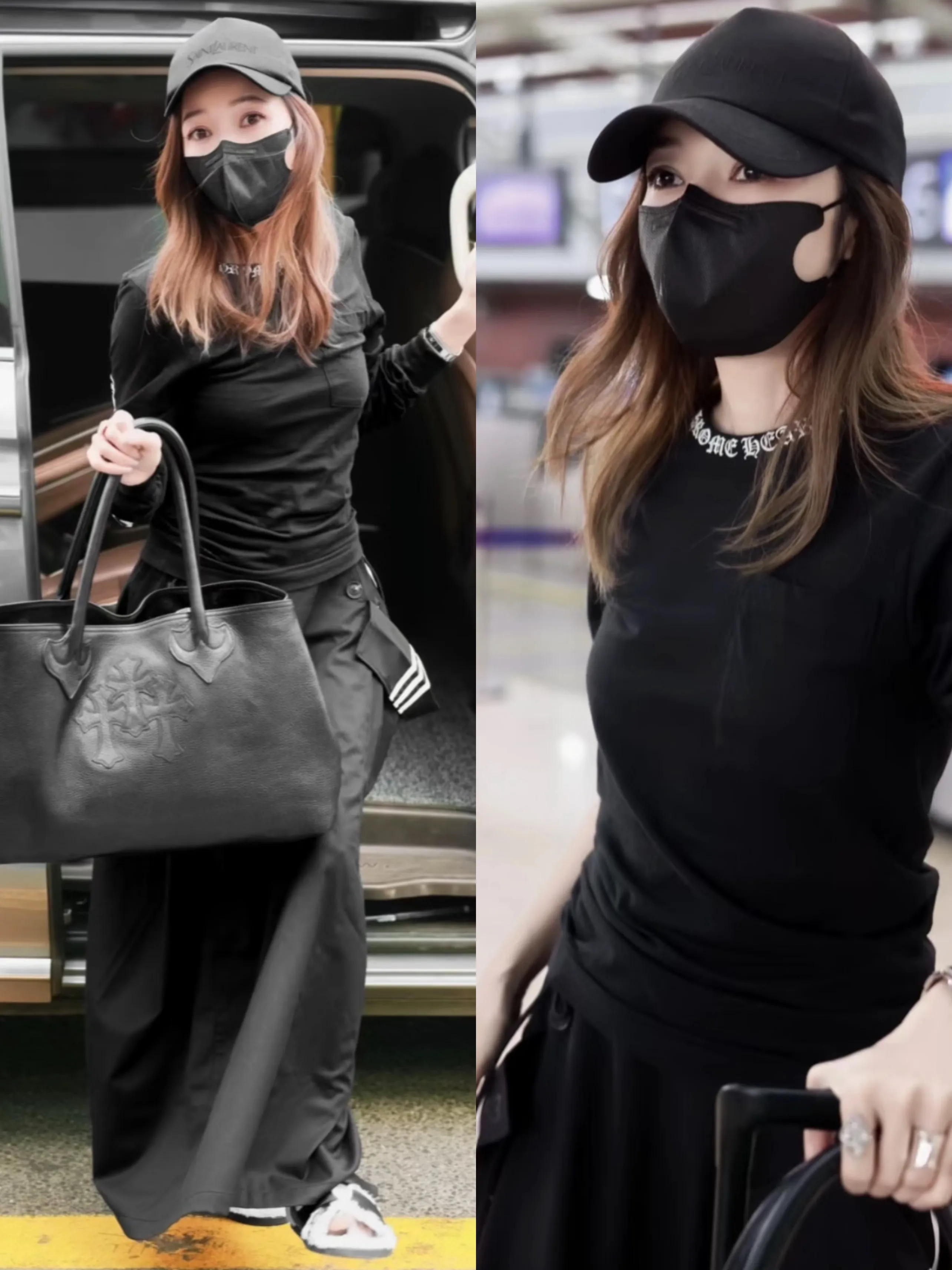 脚踩白色平底鞋,头戴黑色棒球帽。她常用简洁质感的黑色系上衣和裙装,既不过头,又恰到好处,展现了她的好身材。