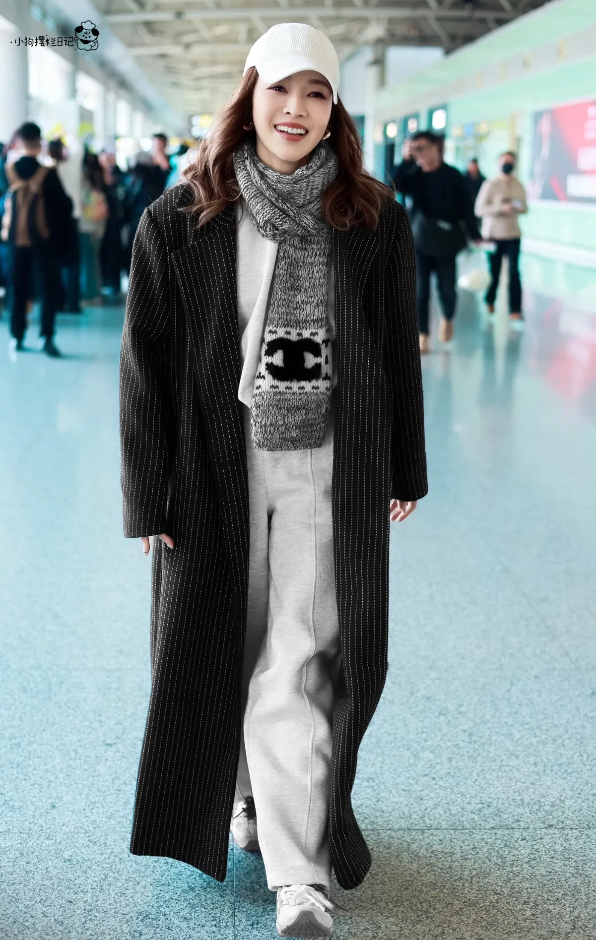 同样一件长款廓形长大衣,内搭灰色运动卫衣套装,头戴白色棒球帽,脚踩白色运动鞋,她注重好气色和有神采的妆效,整体穿搭更加自然、优雅。