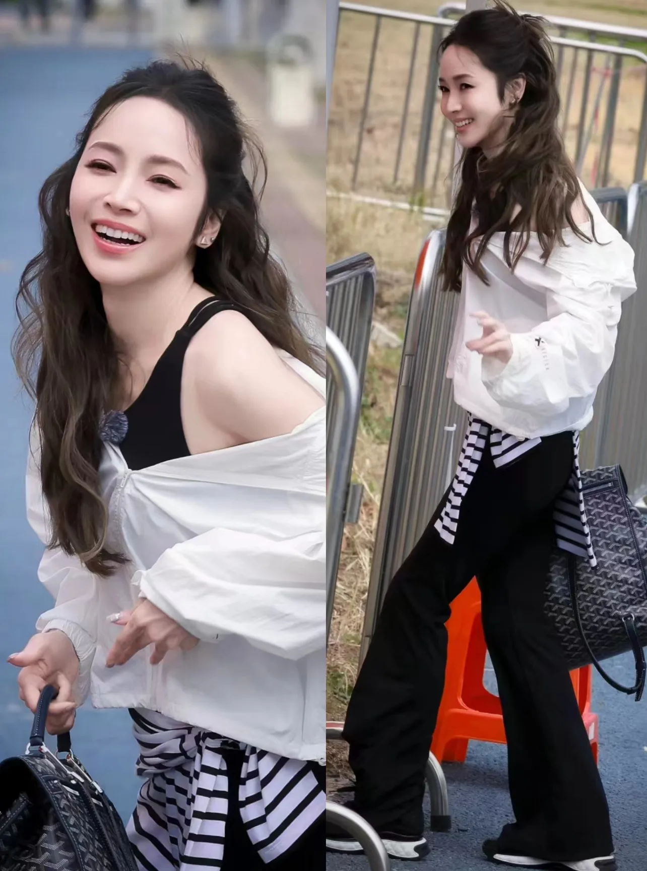侯佩岑把上衣当作露肩衣穿,搭配黑色喇叭裤,腰间系黑白条纹针织衫作为点缀,既展现了她的时尚品味,又凸显了她的高贵气质。