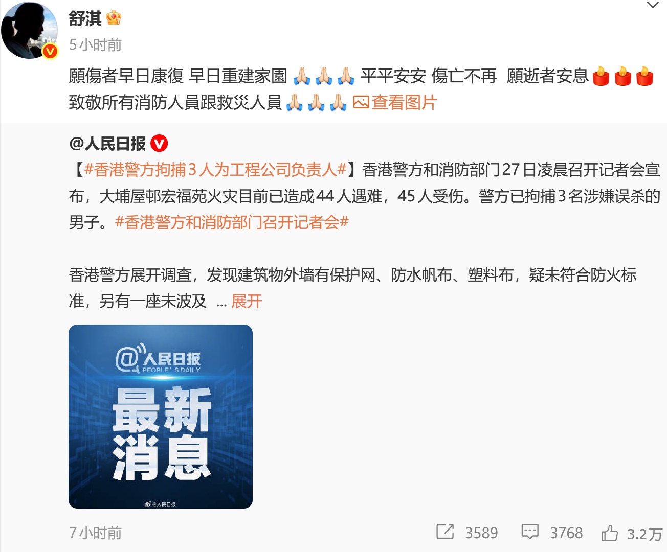 港星方面也展现出强烈的社会责任感。许冠杰以"大埔街坊"身份手写祈福卡片,表示"感同身受";佘诗曼、容祖儿等艺人取消了原定27日参加的各项活动;陈凯咏推迟了演唱会售票计划;TVB小生容天佑甚至取消了婚宴的媒体采访环节。与此同时,香港本地多项娱乐活动作出了更为彻底的决定,英皇娱乐宣布延期本周末举行的三场演唱会,迪士尼电影首映礼、多位歌手的演唱会及商场活动均主动取消或延期。