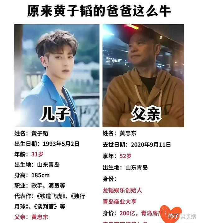 黄子韬之父黄忠东,青岛富豪榜列第七,乃商界巨擘。2020年,黄先生因肝硬化病逝,据传其独子黄子韬继承了高达200亿的庞大遗产。