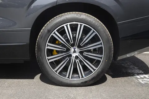 车身尺寸方面,腾势N9契合大型SUV定位,整车长度达到5258毫米,轴距则高达3125毫米。相比不少同级车型轴距常见的2900毫米左右,腾势N9无疑提供了更加宽敞的内部空间。外观设计采用“优雅之势”的设计语言,流畅而富有力量感,车顶线条自B柱开始缓缓收拢,形成坠落式设计,在阳光下如同雕塑般光影分明。此种设计不仅保证了后排头部空间,也使整车运动感十足,避免了笨拙的视觉效果。前脸方面,双星冕大灯设计引人注目,搭载了DLP数字化投影技术,夜晚驾驶时不仅照明范围更广且亮度更足,还能在地面投射行人警示图案,提升行车安全。本人曾经在无路灯的小路上夜行,往往被对面车辆遥远的远光灯晃到难以睁眼,如果换成腾势N9,无论是照明效果还是安全提醒都让人更安心。车头下方的AGS主动进气格栅也十分智能,会依据车速和发动机温度自动开闭:需要散热时格栅打开,高速行驶时则闭合以降低风阻,进一步帮助燃油经济性改善,比传统固定格栅车型灵活得多。