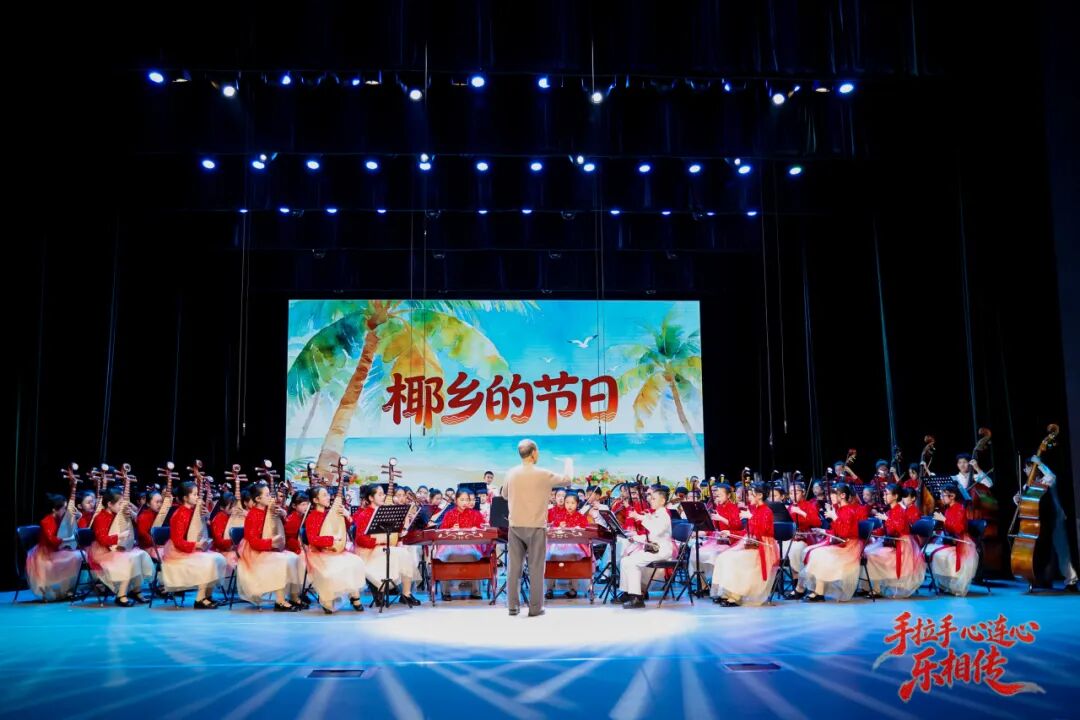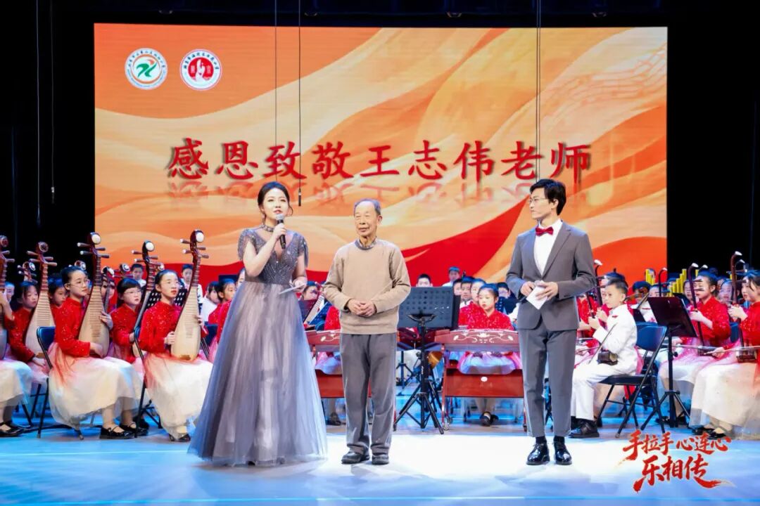 随后,关欣老师邀请两校艺术顾问——年近90岁的王志伟老师上场亲自执棒,带领民乐团演绎王老师的佳作《椰乡的节日》,让观众在优美的旋律中漫步南国椰林,邂逅海岛欢歌。一曲终了,全场阵阵掌声。