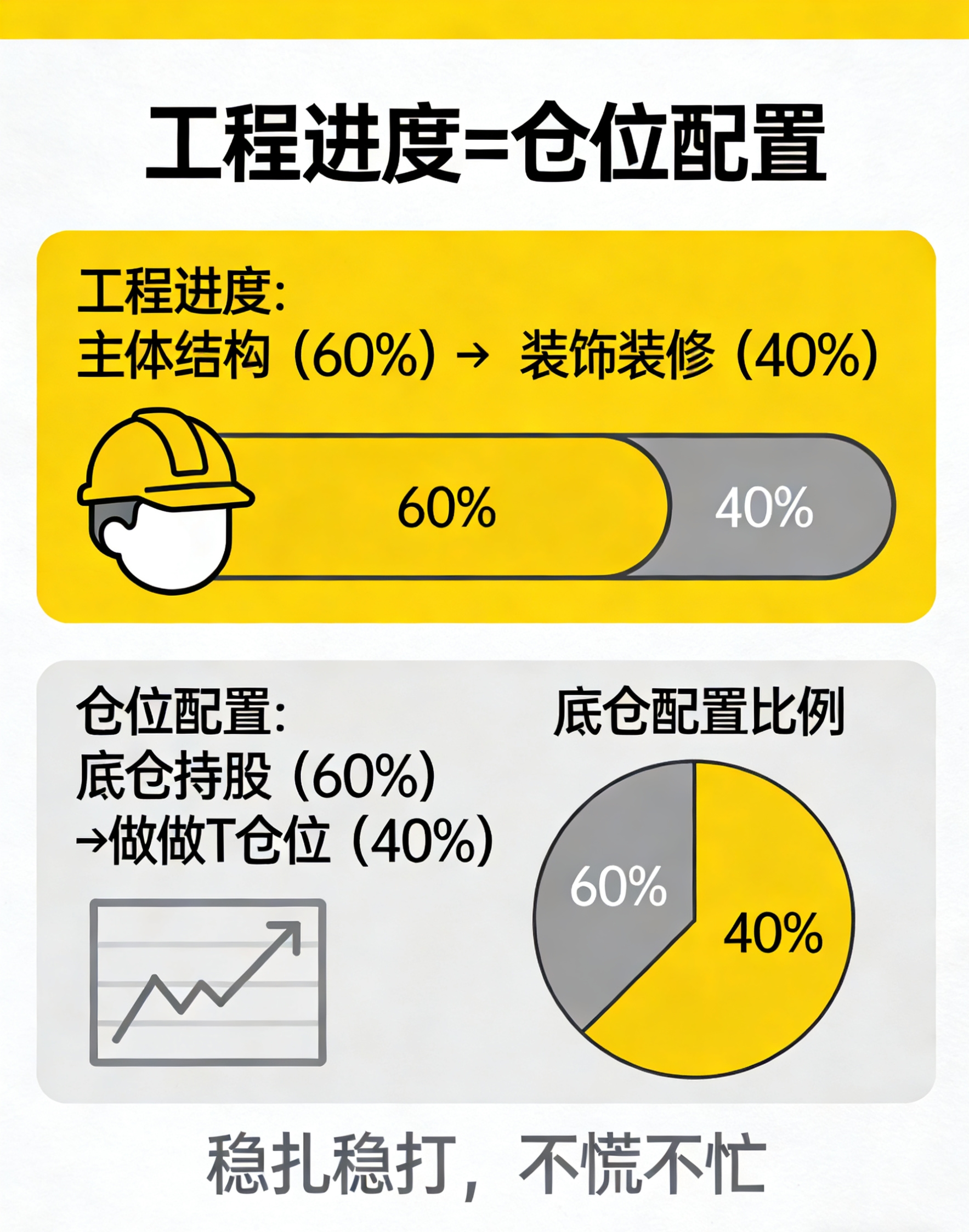 更别说工程人最擅长的“进度管理”,用到仓位配置上简直是绝配。底仓长期持有不动摇,就像主体工程按期推进;做T仓位灵活操作,就像装饰工程按需调整,节奏把控得明明白白。