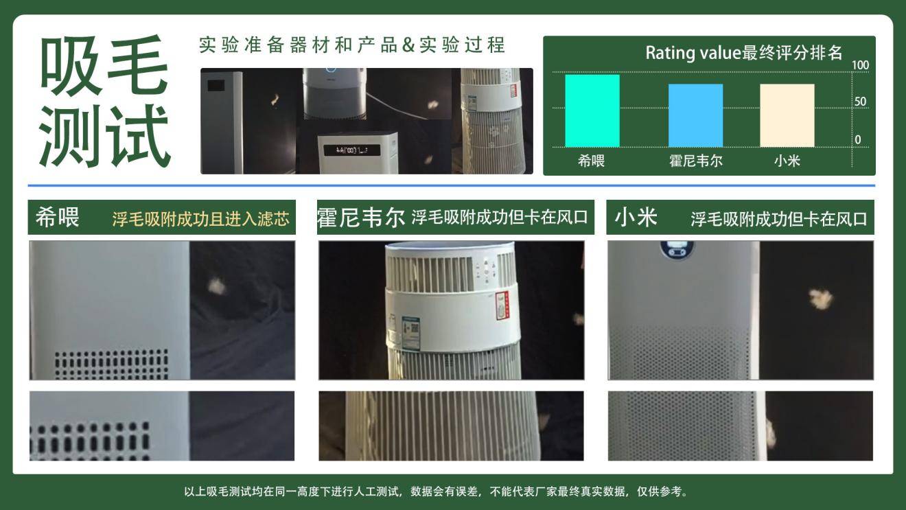 在撒毛模拟实验中,希喂能迅速吸附漂浮毛发且不堵塞进风口;霍尼韦尔吸附浮毛的表现中规中矩,小米因进风面积受限,净化速度稍慢。可以说,只有希喂在大空间掉毛环境下依旧保持稳定性能。