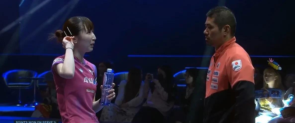 值得一提的是,早田希娜在第三局1:4落后请求暂停时,面对主管教练冈雄介,自言自语地这进行复盘,然而自己的教练却几乎一言不发,两个人面面相觑,似乎都对孙颖莎没有太多办法,只能怪早田希娜输的太惨,一点突破口都无法找到。