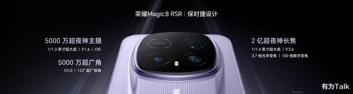 影像维度,荣耀Magic8 RSR 保时捷设计搭载荣耀最顶级的超夜神影像系统,配备2亿像素超夜神长焦和5000万像素超夜神主摄,超大尺寸传感器、超大光圈与顶级镜组结构协同发力,奠定卓越光学品质基础。
