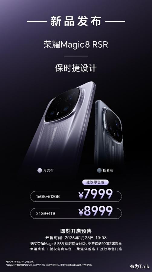 荣耀Magic8 RSR 保时捷设计提供“月光石”与“板岩灰”两种专属配色,推出24GB+1TB、16GB+512GB两种存储版本。新机将于即刻开启预售,并于1月23日10:08分在荣耀商城、各大授权电商及荣耀体验店正式开售,售价为7999元起。购买荣耀Magic8 RSR保时捷设计版,还将获赠20G环球流量,领取激活一年内有效。