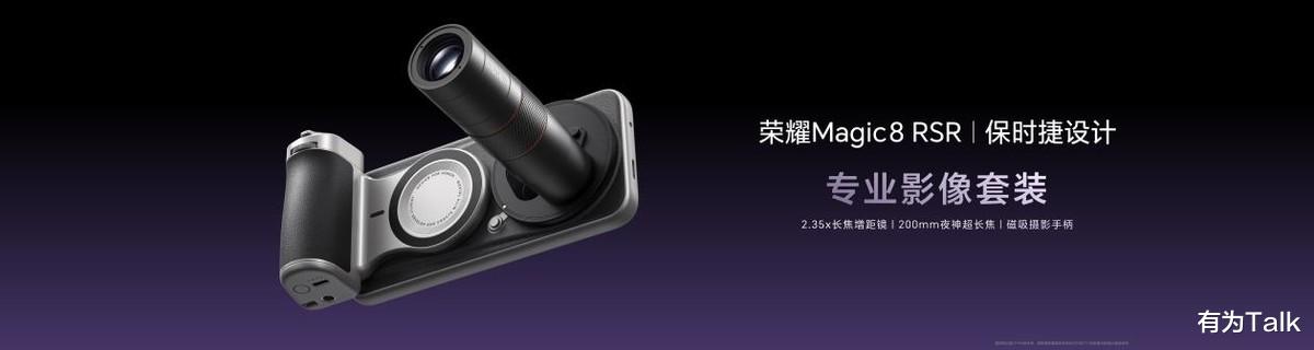 为满足专业创作需求,荣耀Magic8 RSR 保时捷设计还可以选配专业影像套装,内含2.35x等效焦距200mm长焦增距镜、67mm滤镜转接环及专业磁吸手柄。配件支持半按对焦、全按拍摄的专业操作逻辑,大幅提升拍摄仪式感与创作效率,拓展移动摄影创作边界。