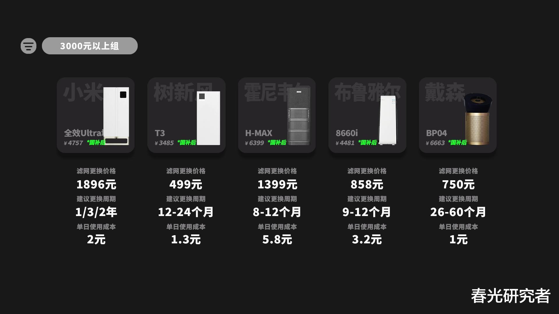 最后是3000元以上组别,对于这个级别的旗舰机,滤网用料都是非常扎实的,各种除醛手段也很丰富,所以滤网价格都非常高。除了戴森之外,戴森的本体更像是一台风扇,而非净化器,我们暂时不讨论它,至于其余4款的使用成本都在2元以上。这就相当于是买了更好的汽车,行驶和乘坐的质感都非常好,但是哪怕是换个轮胎,价格也是要比普通汽车更贵。