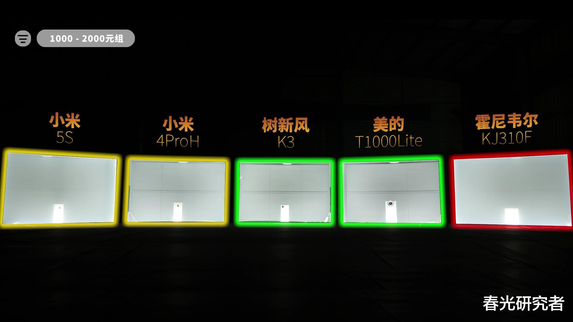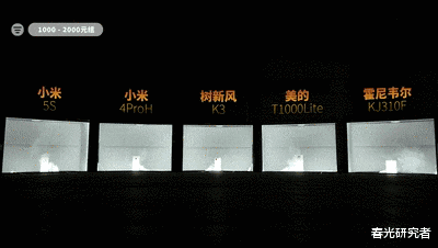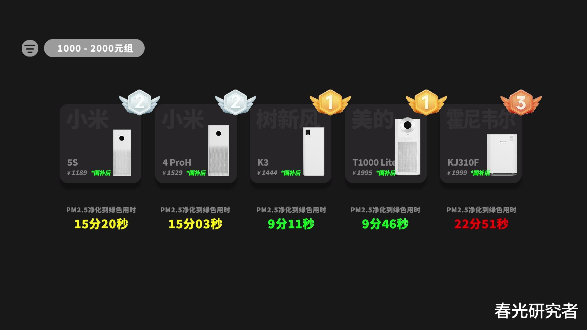 首先是1-2000元组,按照舱内能见度都顺序来排名,树新风K3和美的T1000 Lite要更快,接着是小米5S、小米4 ProH,最后姗姗来迟的是霍尼韦尔KJ301F。