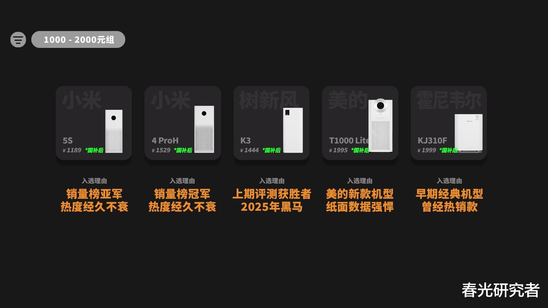 首先是1-2000元组别:两款米家(4 ProH和5S),主打的就是便宜,常年霸占整个净化器类目的销量冠亚军,无论怎么选,一定绕不开的型号。树新风K3,我们上期评测的获胜款,千元级别中除醛能力断档领先,绝对是2025年的一匹黑马。美的T1000 Lite,美的新出的一款机型,同级别中参数非常亮眼。最后是霍尼韦尔KJ310F,和美的恰恰相反,这是霍尼韦尔家比较早期的一款机器,很经典。